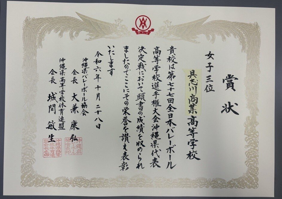 10月27日・28日に行われた全日本バレーボール高等学校選手権大会沖縄県代表決定戦において、【女子3位】という好成績を収めることが出来ました。今後もシード校の名に恥じぬよう日々練習に取り組んでいきます。12月に行われる県高校新人体育大会では優勝を目指します。応援していただいた保護者や関係者の皆様ありがとうございました!今後とも宜しくお願いいたします。